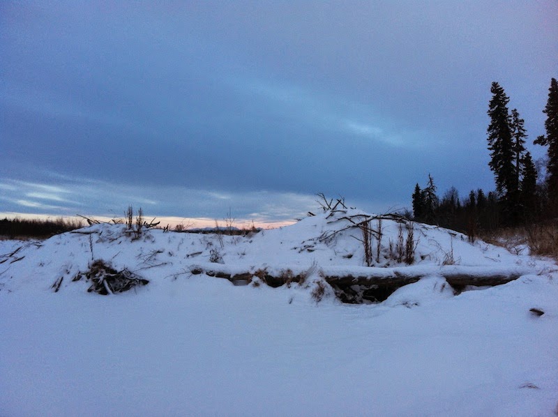 We got a bit earlier start this morning, and arrived on the line not long after the 10AM-ish sunrise. Upon relocating our trail in the semi-dark, we entered the slough, and followed it to where it's three branches 'Y' out, with us being in the long tail of the Y. If we took the left fork of the Y, we head toward the wolverine cubby and a few sets on the burn edge, leading to some more sets around a large lake in some travel corridors. The right Y heads southerly and has the main body of our marten line thus far. When we got to this juncture, our decision was made easier by these: